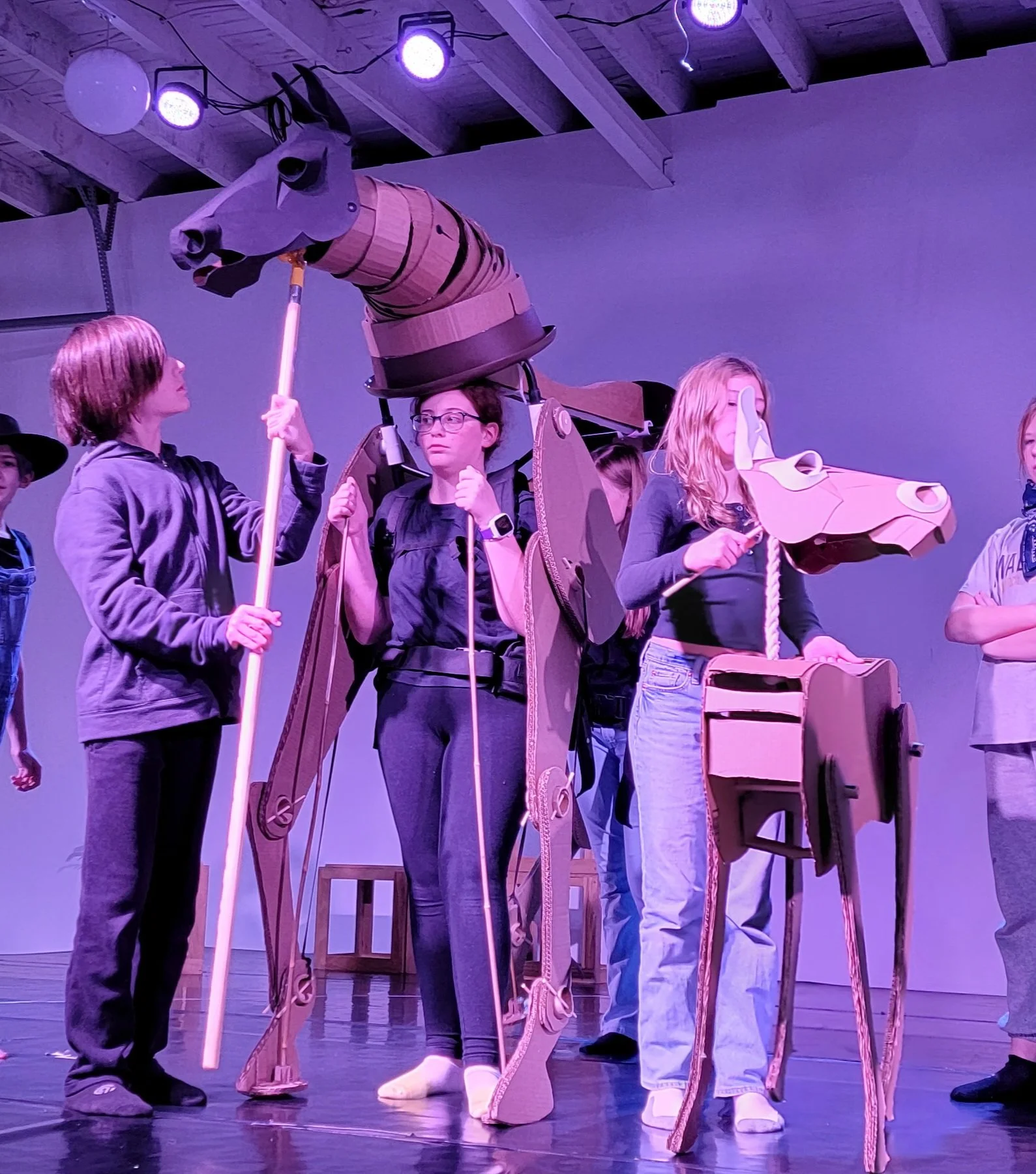 Students rehearse for Jess Noel’s adaptation of Misty of Chincoteague (PACK, 2022). Puppets by Kat Caro.